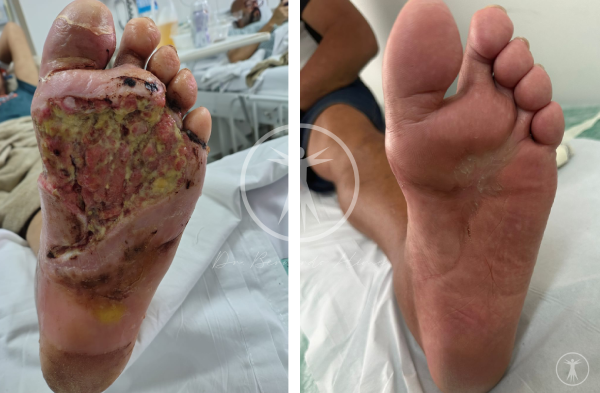 Os pacientes com feridas abertas recebem um protocolo específico para limpeza, controle de infecção e estímulo à cicatrização do pé diabético. O tratamento envolve o uso de curativos especiais, antibióticos e acompanhamento médico frequente.